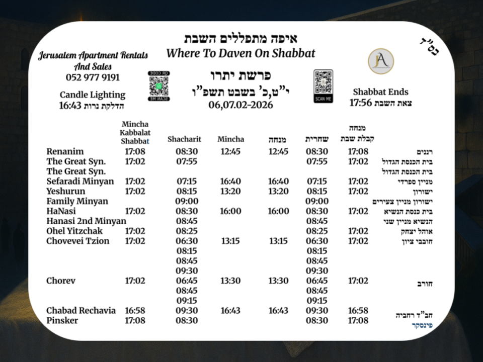 Whether you’re renting, buying ,selling, looking for a Kosher Vacation Apartment, or need professional property management services for your residence, Jerusalem Apartment Rentals and Sales offers the kind of attentive, tailored service that big agencies simply can’t match.